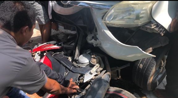 TANJUNGPINANG, Infokepri.com - Diduga gara-gara kaki sipengemudi keram, mobil Toyota Avanza berwarna putih berplat merah yang merupakan milik Pemkab Anambas menabrak sepeda motor merk Yamaha Vixion hingga ringsek di Jalan Ahmad Yani, Km 5 atas, tepatnya di Depan Kantor Cabang Pelni Tanjungpinang, Selasa (17/05) siang sekitar pukul 13.15 WIB.